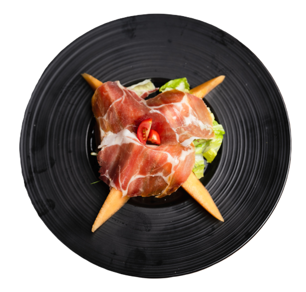 Thinly sliced Parma Ham served with Rock Melon on Greens and Olive Oil Drizzle